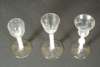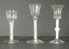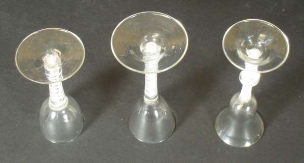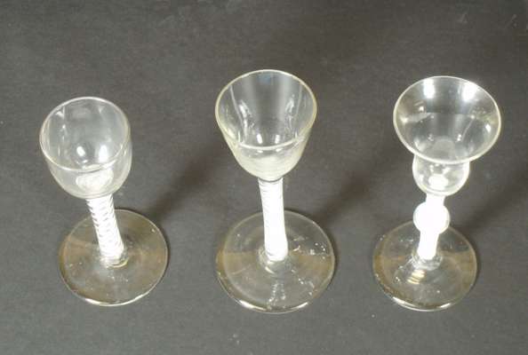 comprising: a cordial glass with ogee bowl, opaque white airtwist stem and conical foot, 13cm high; a glass with bell bowl, knopped opaque white airtwist stem and conical foot, 15.5cm high; and a glass with a rounded funnel bowl, opaque white airtwist stem and conical foot, 16cm high (3)