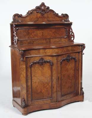 the foliate carved arched backboard with single open shelF with pierced brackets over a moulded serpentine top, frieze drawer two doors, plinth base, flanked by canted corners with acanthus scroll brackets raised on bun feet