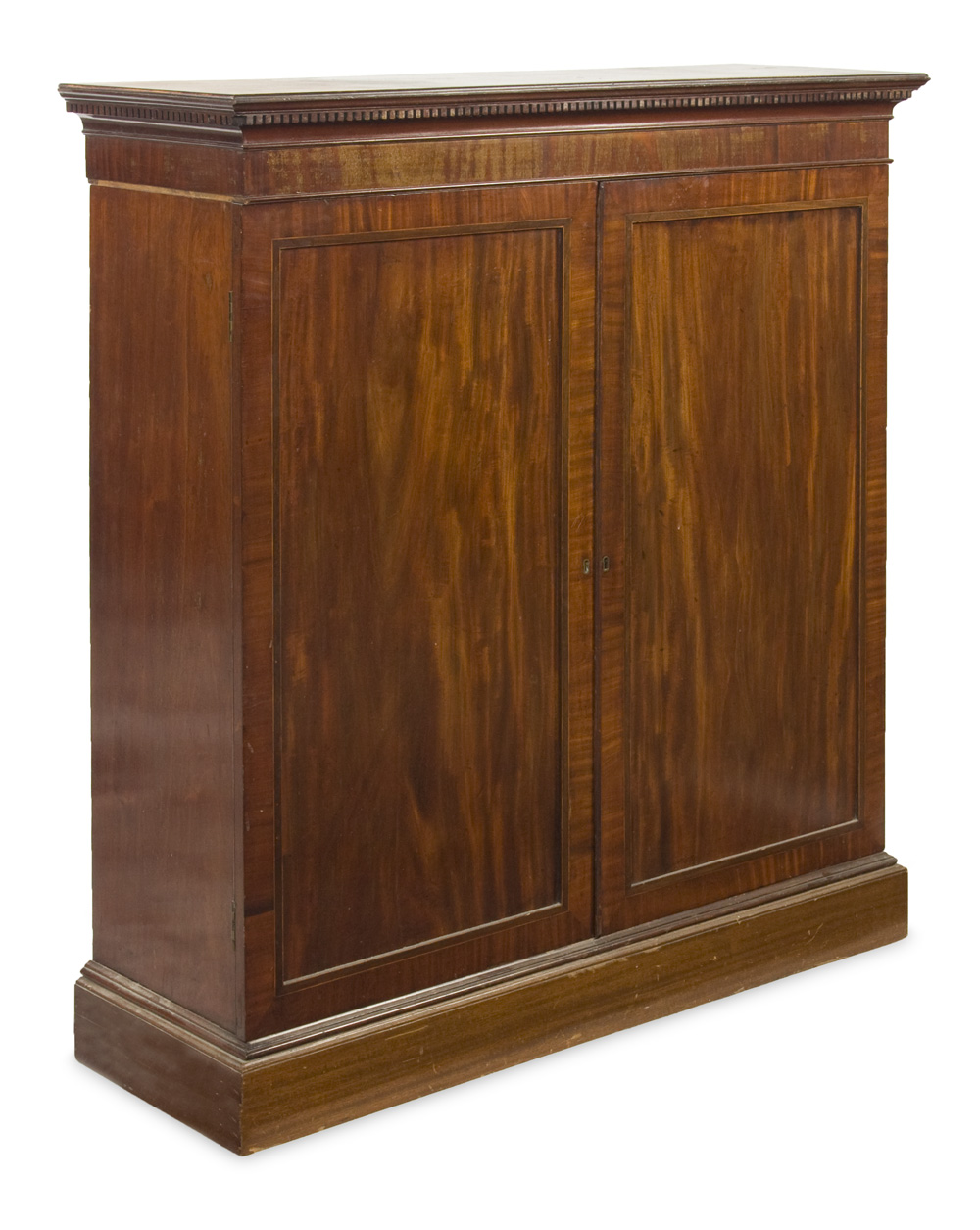 the dentil cornice over plain frieze, two panelled doors enclosing document compartments, raised on plinth base