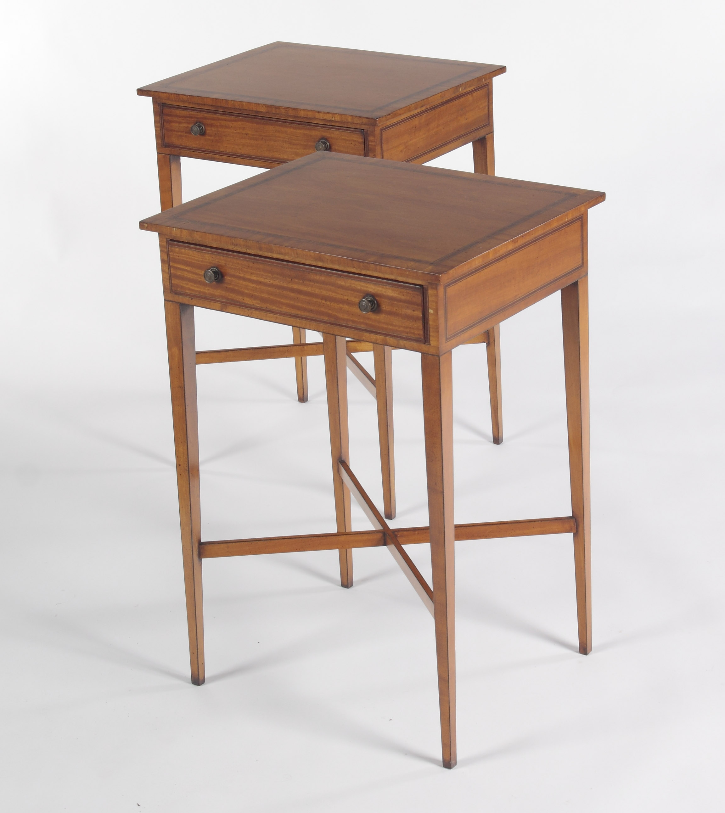 each with crossbanded rectangular top over a frieze drawer raised on ebony strung square tapering legs united by X-stretchers (2)