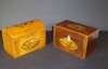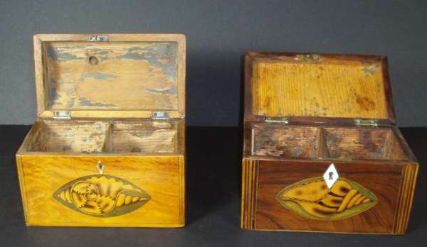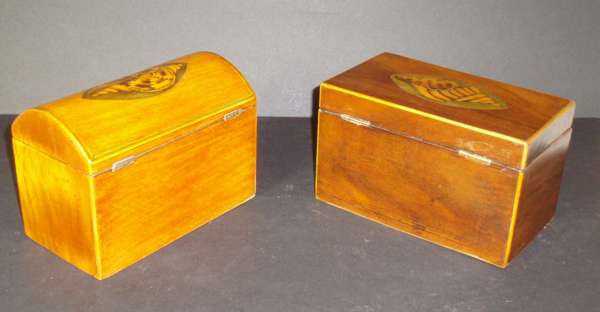 of rectangular form with shell marquetry, the interior with two compartments, 19cm wide, 11.5cm high, 11cm deep; and a Georgian style tea caddy, of domed form with shell marquetry, the interior with two compartments and associated covers, 18.5cm wide, 13cm high, 10.5cm deep (2)