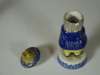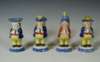 painted in polychrome, comprising: a salt pot, 13cm high; a pepper pot, 14.5cm high; a mustard pot and damaged cover, 14cm high; and a vinegar pot and cover, 15cm high (4)