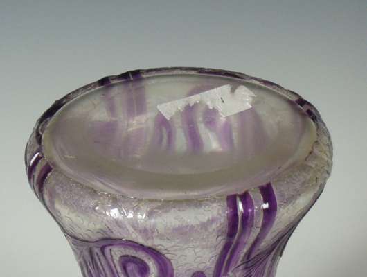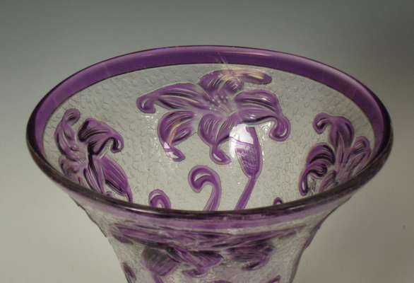 acid etched and carved glass, amethyst overlaid onto clear glass and decorated with flowering plants, stencil etched marks to base