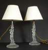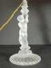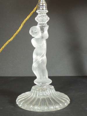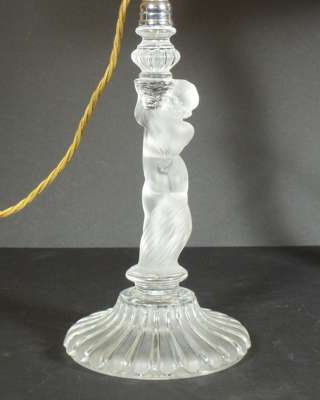 each part frosted and composed of a circular fluted base beneath a column moulded as a cherub holding a fluted vase shaped socket, lamp fittings and shades