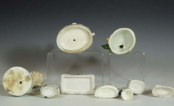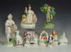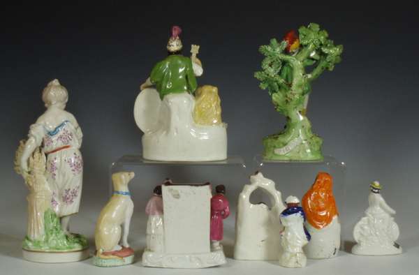 comprising: an early figure of a boy playing a trumpet with bocage, titled 'Walton', 16.5cm high; a figure of Britannia wearing a helmet and carrying a shield and spear, sitting beside a lion, 15.5cm high; six Staffordshire fairings; and a Derby style figure of a girl beside a bushel of wheat, 19.5cm high (9)