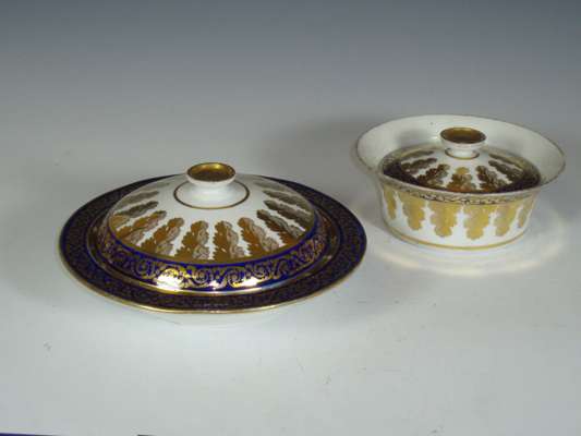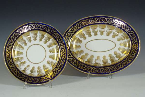 with cobalt blue border and foliate gilt highlights, comprising: twenty graduated saucers, six coffee cups and two tea cups, four graduated dishes, two dishes and covers, sugar bowl and cover, and a slop bowl (36)