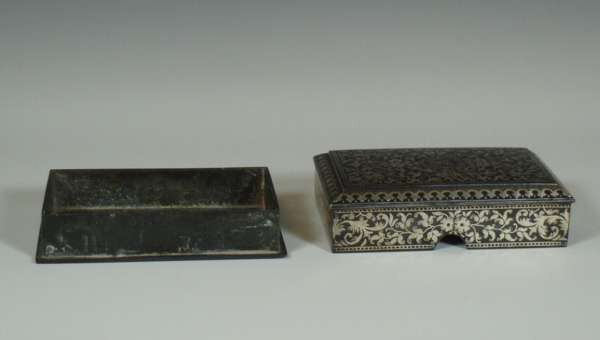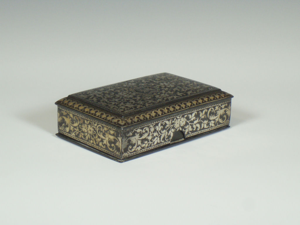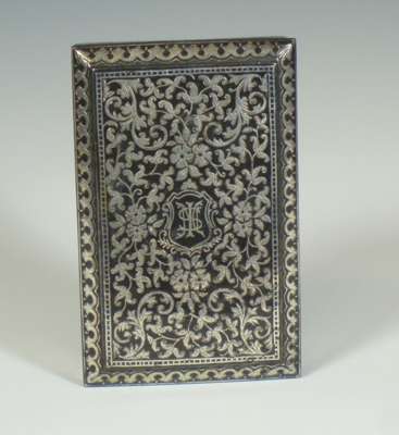 of rectangular form, the cover with central shield cartouche with monogram 'M.I.S.' surrounded by floral white metal inlay