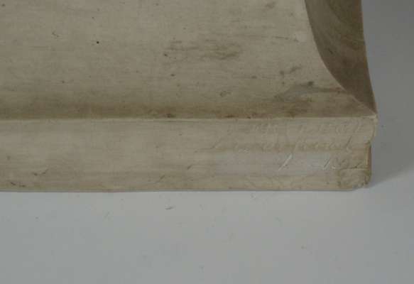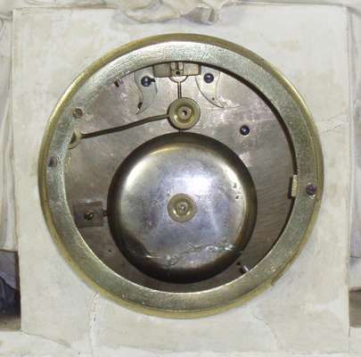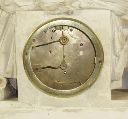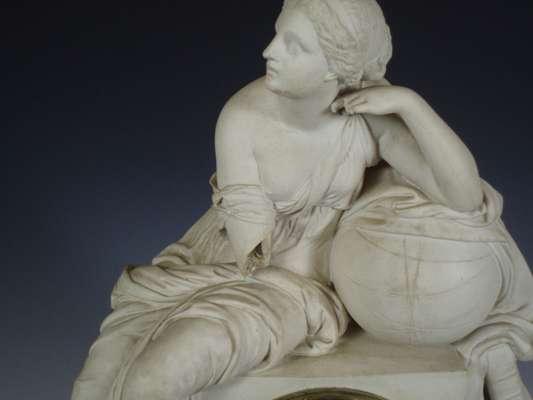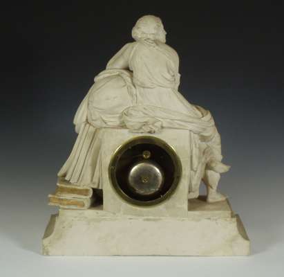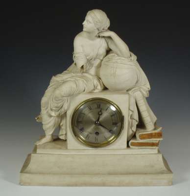 with silvered dial and black Roman numerals, the cylinder movement striking on a bell, the parian ware case with a classical allegorical figure of Knowledge reclining on a globe and books, signed 'F.R. Legge, Liverpool, 1817'