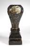 of inverted baluster design painted with ivory cartouches of Chinese figures in garden settings on a mid-blue and gilt ground with reserve diaper panels and scattered foliage, on circular foot and square painted softwood 'faux marble' plinth, veined in ivory and ochre, on a blue ground