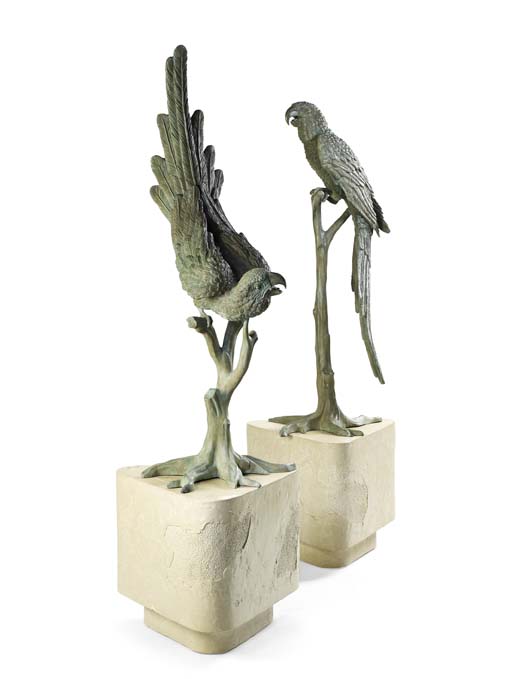 both on naturalistic tree branch perches, also made in bronze, one gazing to dexter, the other crouching with raised tail feathers, pale green patination, on triangular composition plinth bases (2)