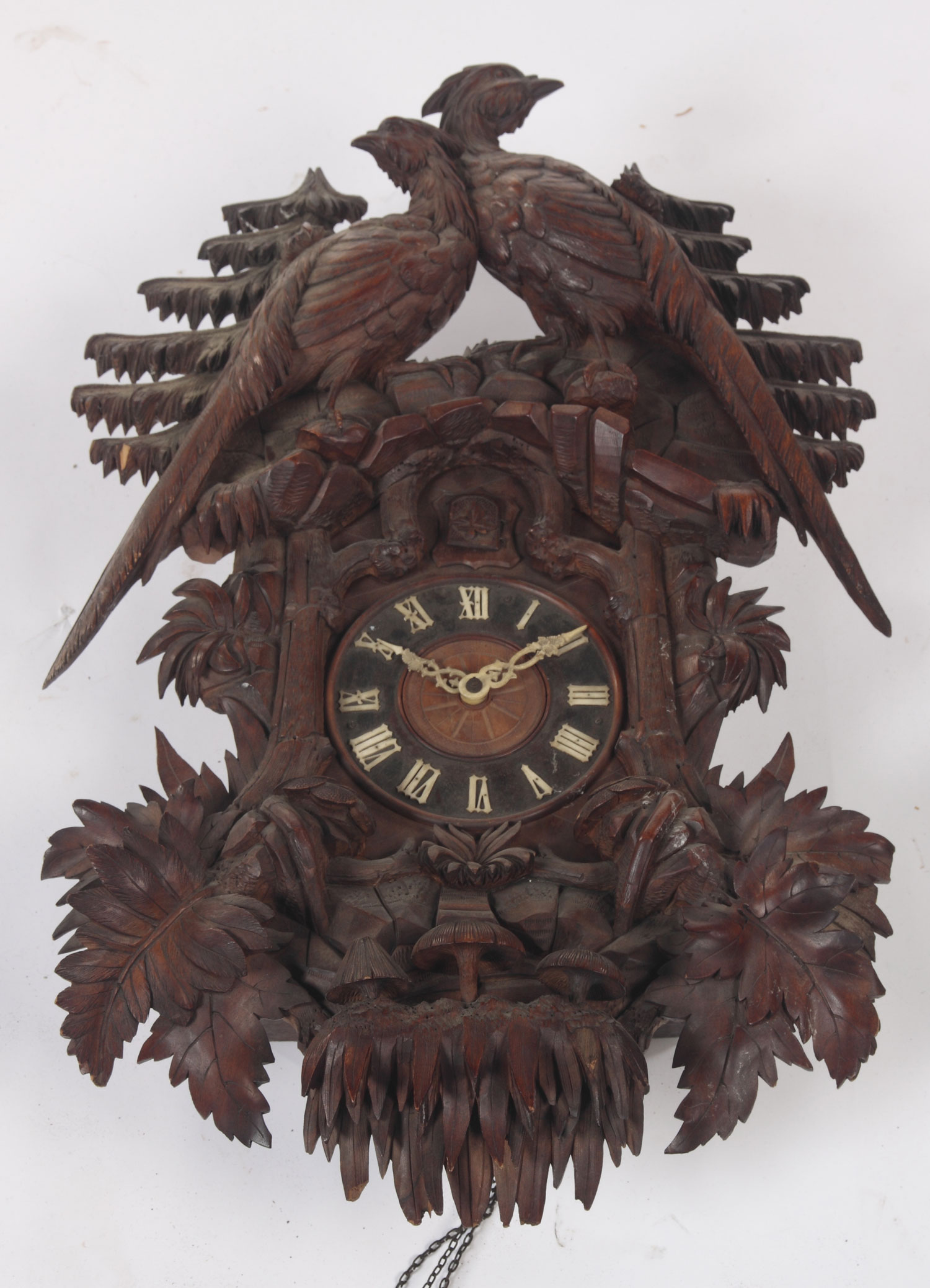 the eight day movement striking the hours on a gong, the case decorated with two cock pheasants and stylised pine trees bounded by rusticated branches and foliage, the base with toadstools and foliate pendant, with two pine cone weights