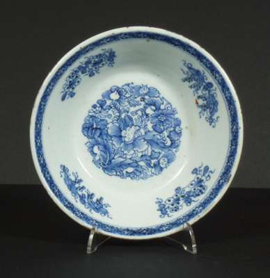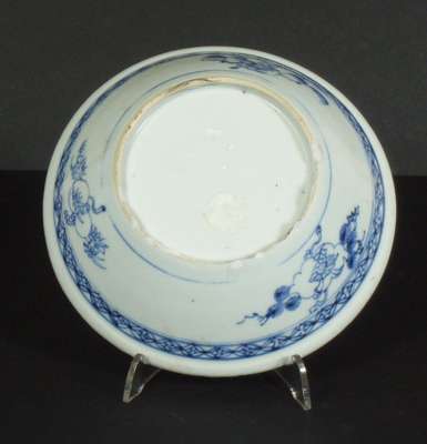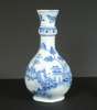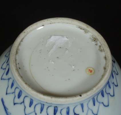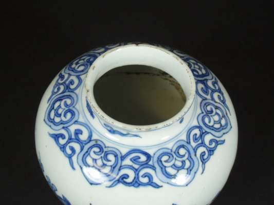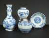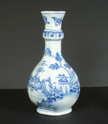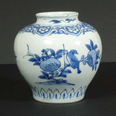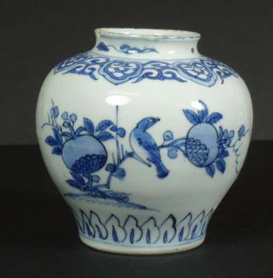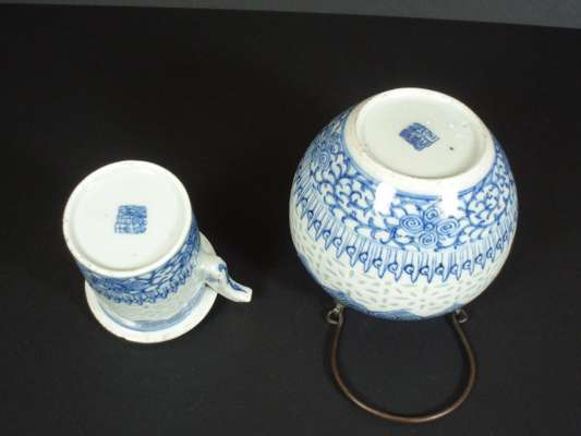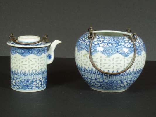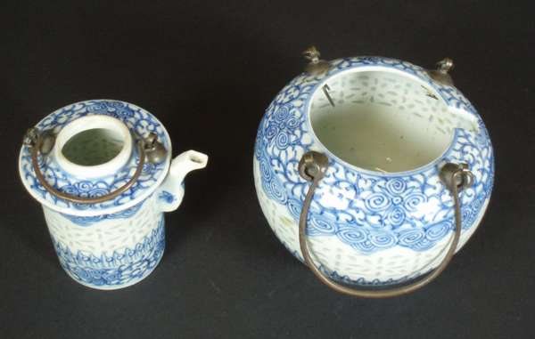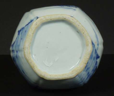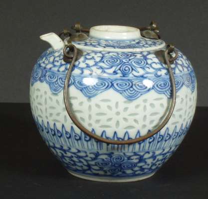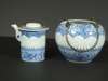 of hexagonal form, decorated with landscapes, 25cm high; a Chinese export blue painted porcelain tea kettle with metal handles, 12cm high; a Chinese blue painted porcelain bowl, 16cm wide; and a small blue painted jar, probably 17th century decorated with pomegranates and birds, 12cm high (4)