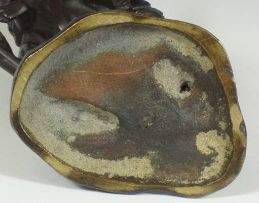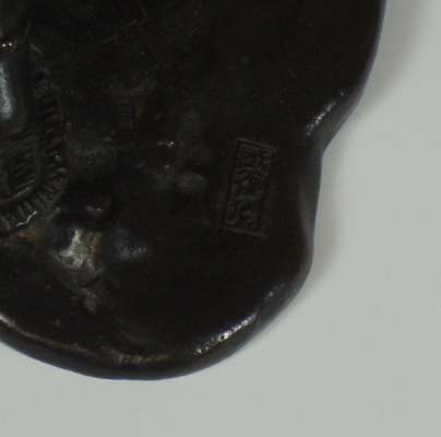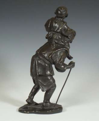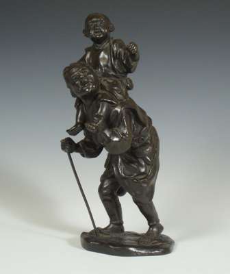 depicting an old man leaning forward on his walking stick, with a child on his shoulders, signed