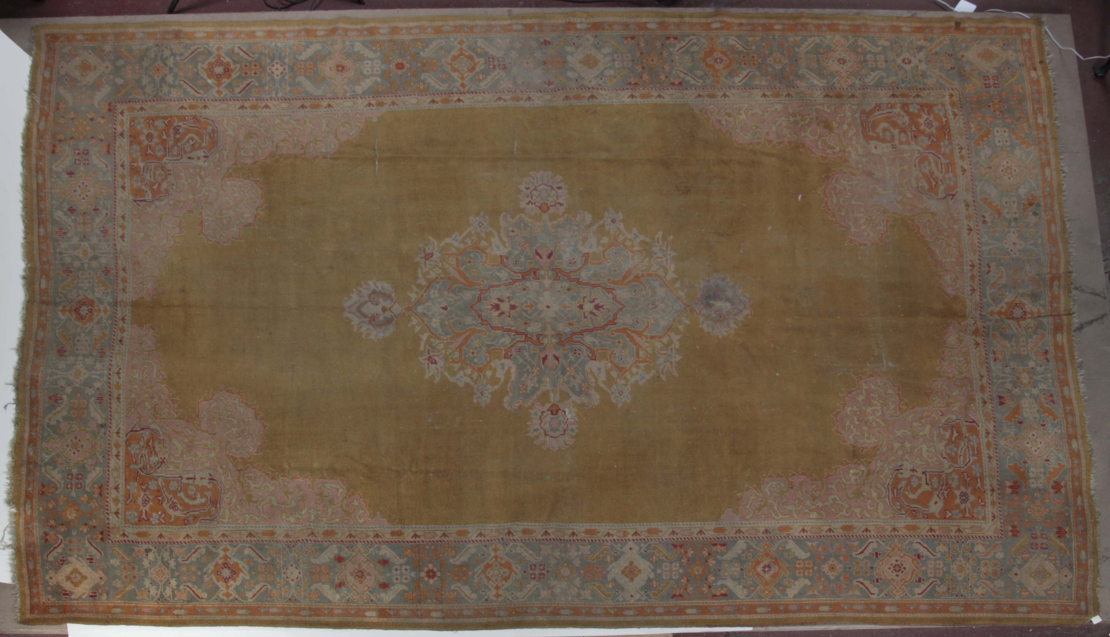 late 19th/early 20th century, the plain mustard field with central blue medallion, pink and orange spandrels, within blue palmette and foliate border between bands