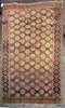 early 20th century, the abrash rust red field with allover lattice containing light brown and blue guls, within dark brown geometric lattice border