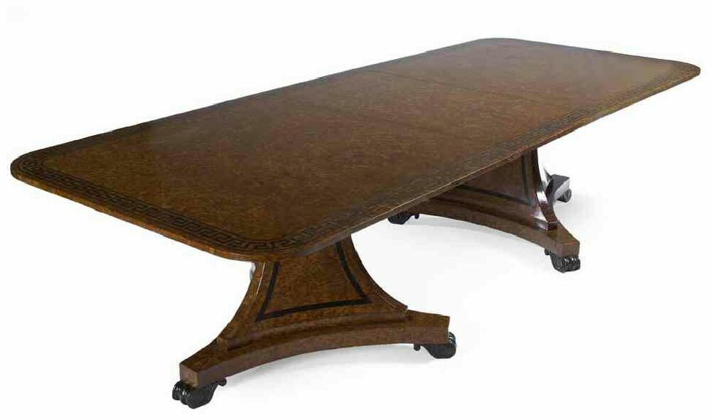 A Regency style burr oak and inlaid pedestal dining table In the manner of George Bullock