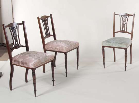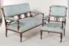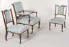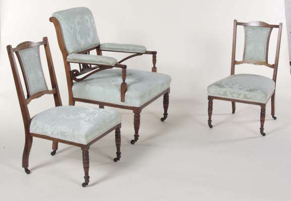 with cushioned back with open arms and vase turned supports, the cushioned seat raised on tapering ring turned legs terminating in ceramic castors, comprising: a settee; two arm chairs; and five side chairs (8)