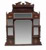 the broken pediment over a concave frieze panel, a arrangement of rectangular mirror plates and shelves