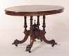 the moulded oval top with quartered veneers, plain frieze, on four fluted columns joined by a central boss, scrolled legs terminating in