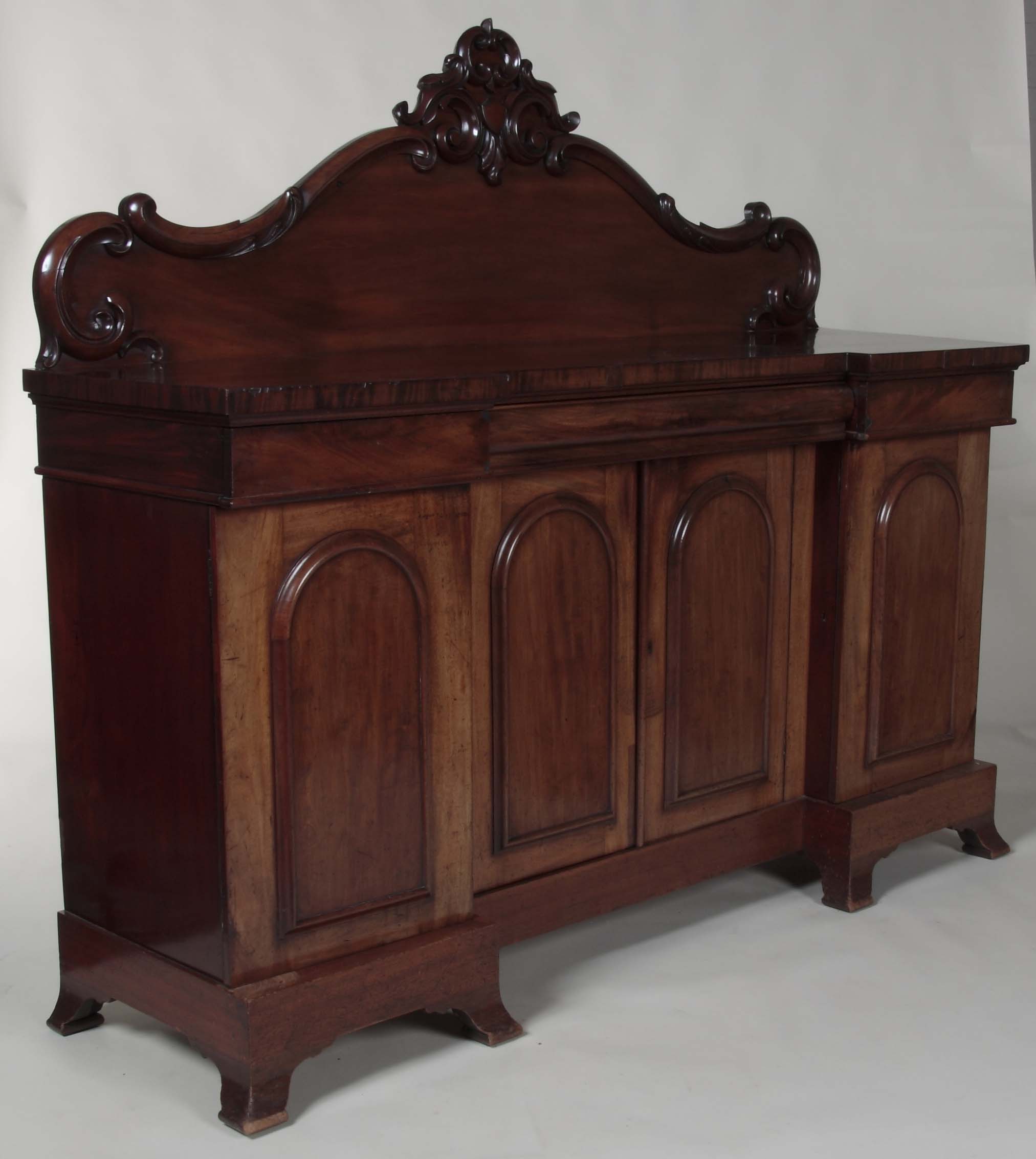 the arched foliate carved back board over three cancelled frieze drawers, four arched panelled doors raised on splayed bracket feet