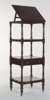 the adjustable slope over three open shelves and a single drawer, raised on baluster turned supports terminating in brass caps and castors