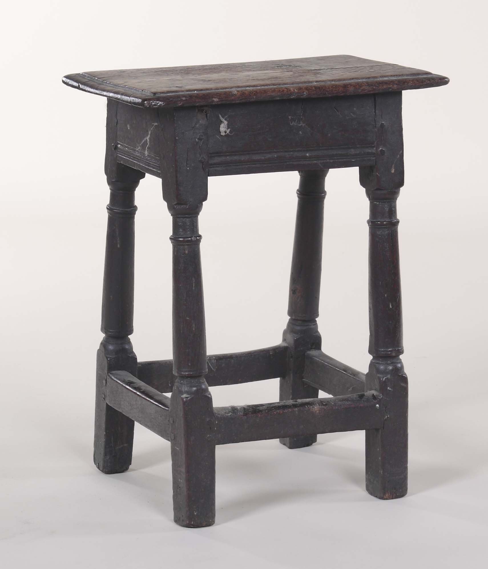 the moulded rectangular top over frieze panel stamped 'W.R' raised on splayed baluster turned legs united by stretchers