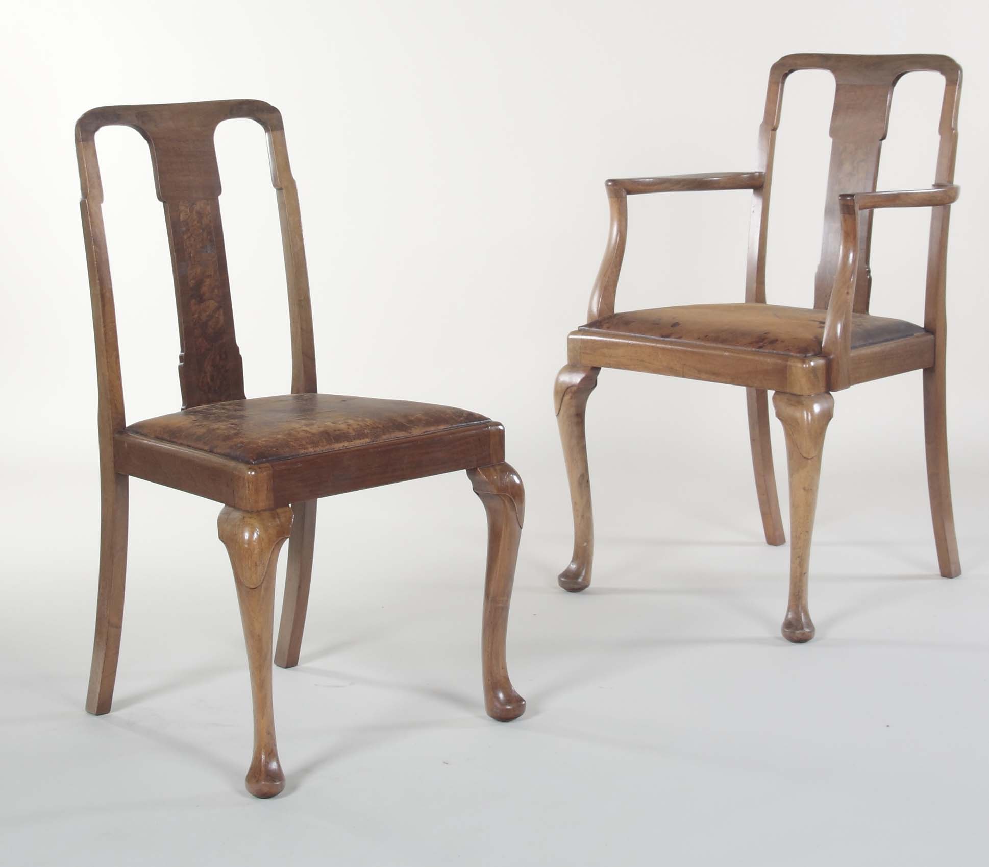 each with a solid vertical splat, leather drop-in pad seats, raised on cabriole legs terminating in pad feet; including two carvers (6)