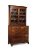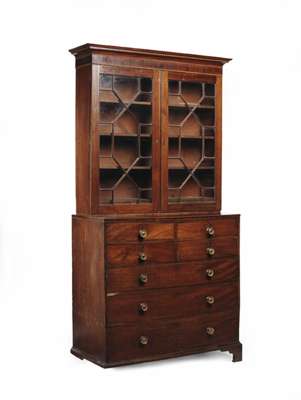 the chequer banded cavetto moulded cornices above multi panel astragal glazed doors enclosing adjustable shelves, the lower sections inlaid with stringing and with crossbanded tops above four short and three long drawers, raised on shaped bracket feet (2)