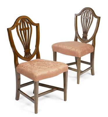 the shield shaped backs with pierced vase shaped splats above overstuffed bowed seats covered in foliate figured pink damask fabric, on square tapered legs joined by H-stretchers (19)