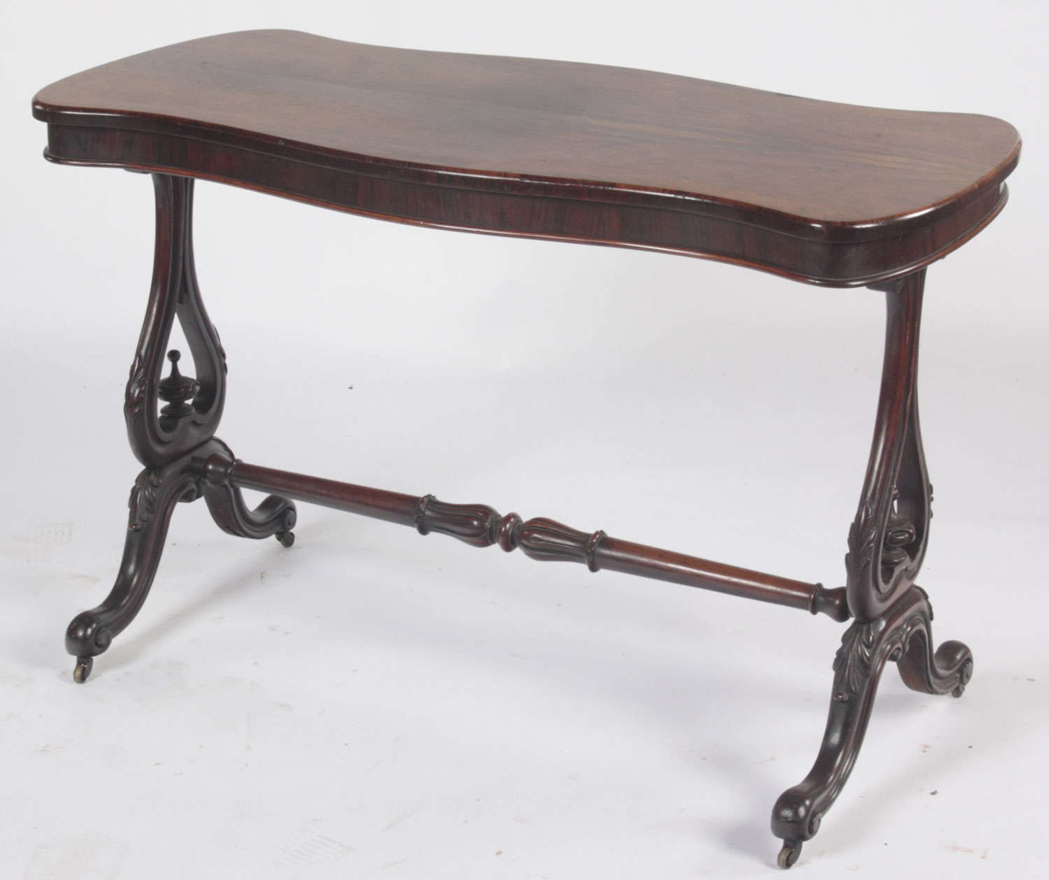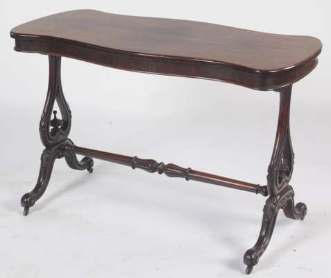 the top of serpentine outline above plain frieze and lyre-carved supports carved with acanthus, on dual splay scrolling legs ending in castors united by a pole stretcher