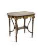 the bow ended top decorated with urns above a shaped and similarly inlaid frieze and moulded square tapering legs united by an understage on inscrolling supports, on castors