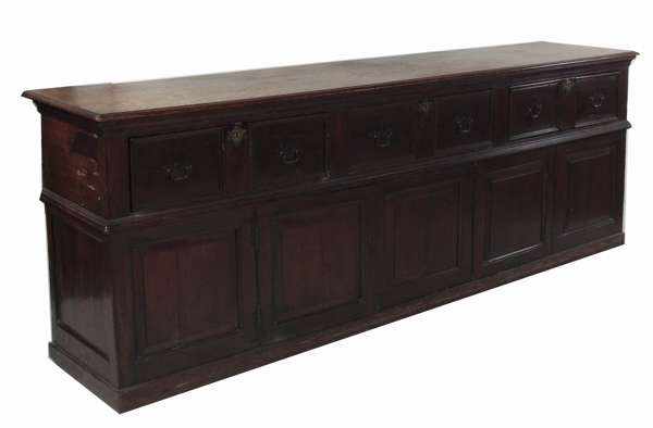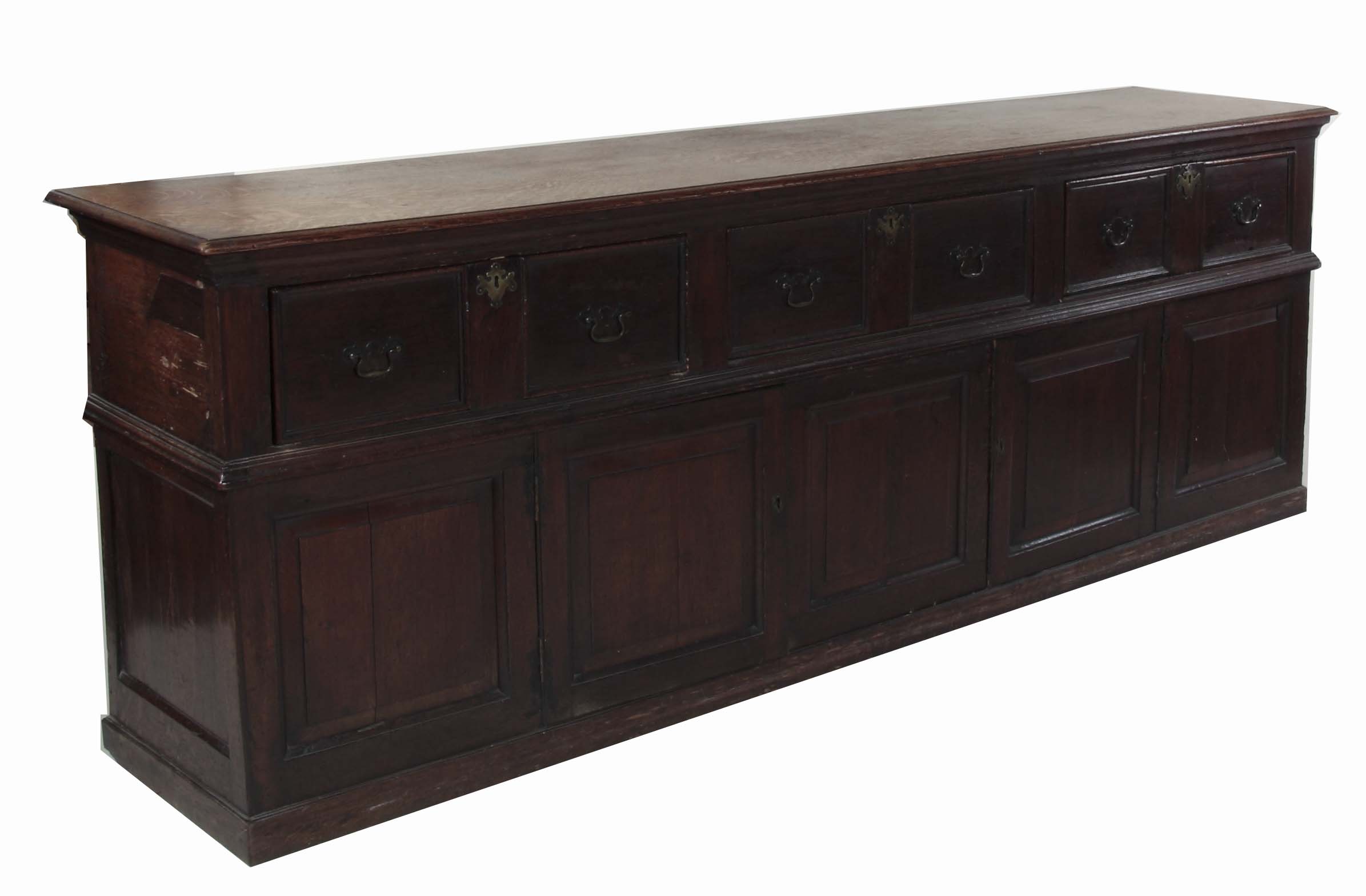 the moulded rectangular top over three panelled frieze drawers, panelled cupboards raised on plinth base