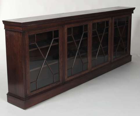 the projected moulded cornice over a plain frieze panel, four astragal glazed doors enclosing shelves, raised on plinth base