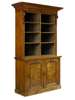 the broad projecting cornice above two bays of four open shelves between moulded pilasters with leaf carved corbels, the lower part with a pair of panelled cupboard doors with foliate crestings, on plinth base