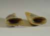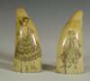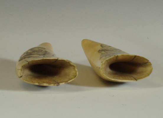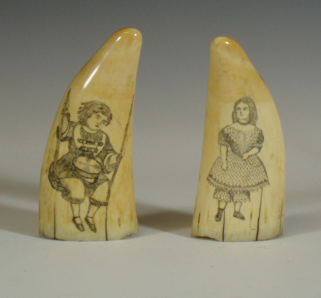 with double sided engraving of a girl on a swing and a standing girl, 12cm long; and another scrimshaw whale's tooth with double sided engraving of a boy and a girl, 11cm long (2)