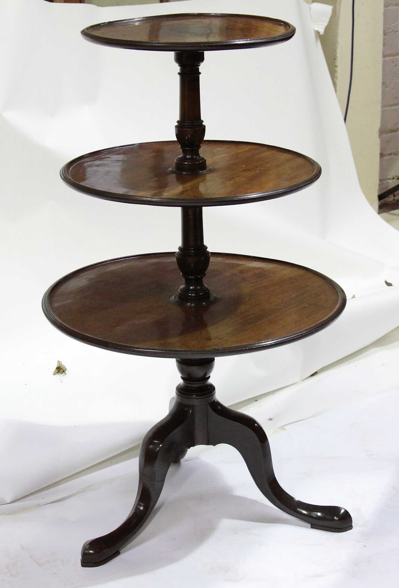 of three dished and graduated circular tiers on baluster supports and cabriole tripod base with pointed pad feet and castors