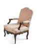 the arched back above padded outscrolling arms and serpentine stuffover seat upholstered in pale pink damask, on rocaille carved apron and cabriole legs ending in hoof feet
