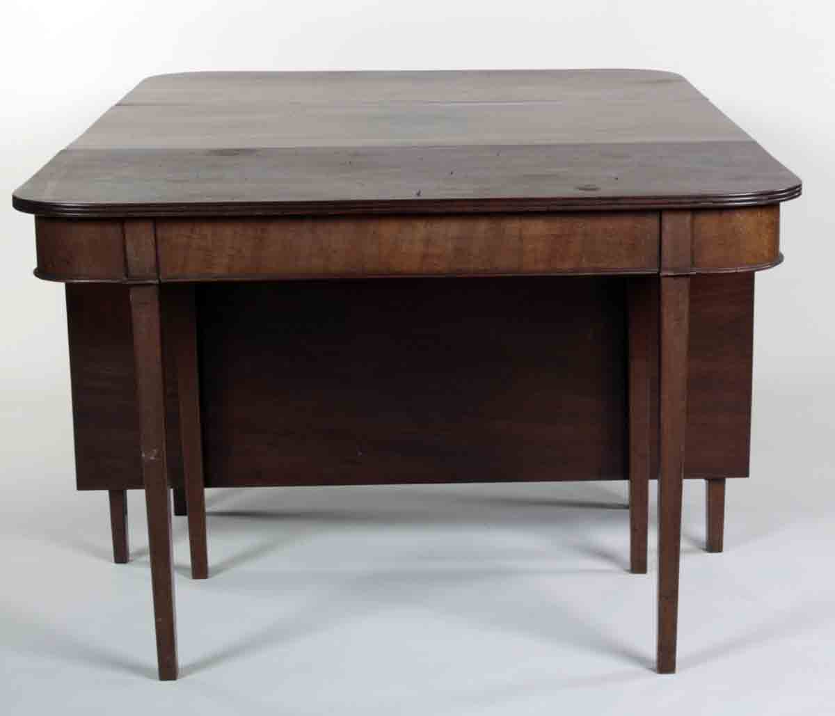 the rounded rectangular top comprising a central drop leaf section and two D-end sections with reeded edges above a lipped frieze, on square tapering legs with gate action