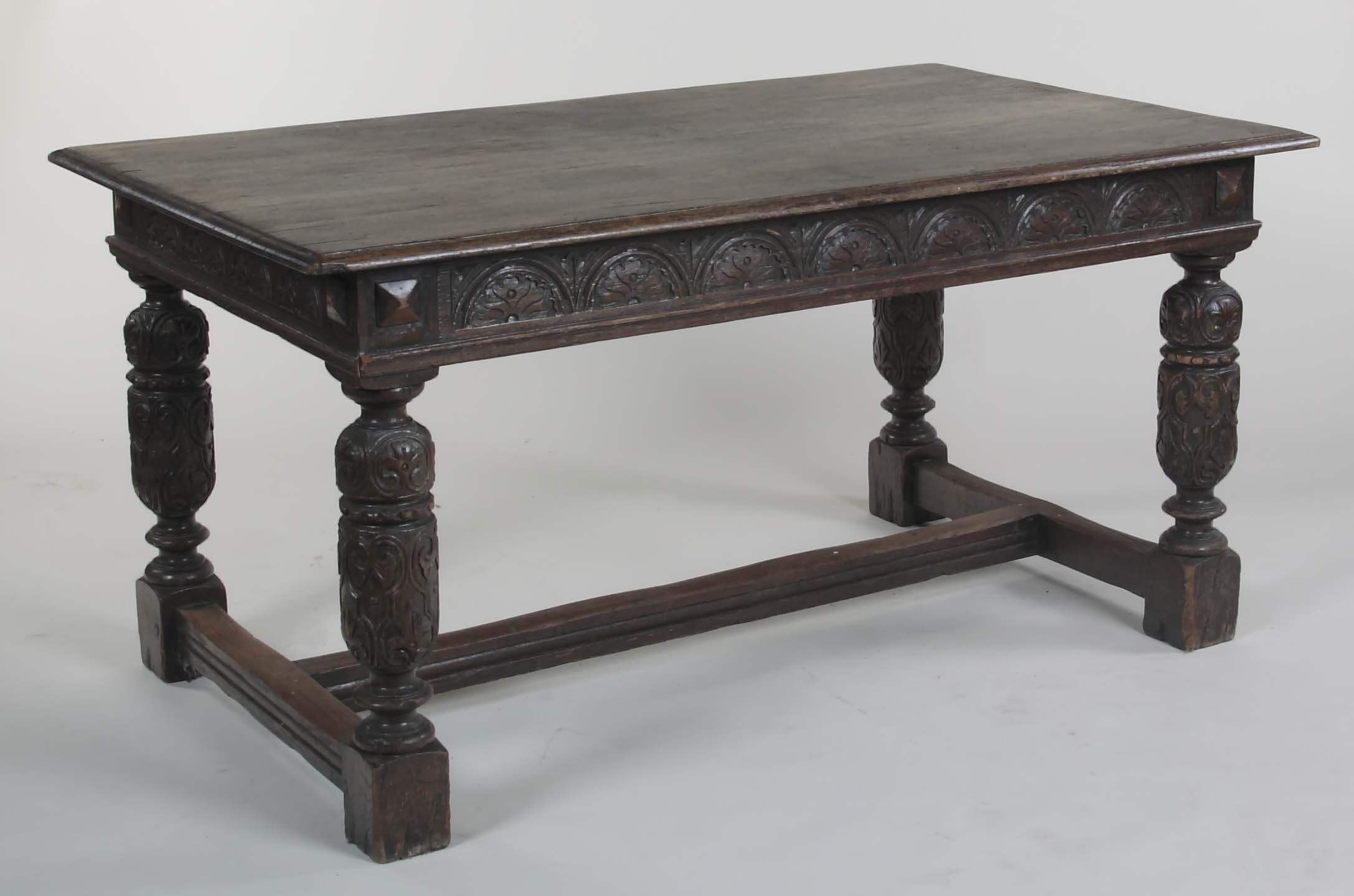 the moulded rectangular top over carved frieze panel raised on carved turned legs united by stretchers