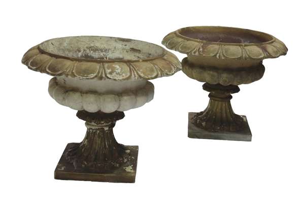the lappet carved and gadrooned bowls of shallow form, on fluted socles and plinth bases (2)