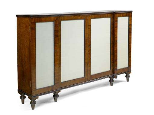of inverted breakfront form, the top with reeded edge above four fabric lined panel doors enclosing shelves, on short ring turned feet
