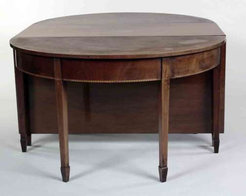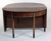 the bow-ended rectangular top comprising a drop leaf centre section and two demi-lune ends, the plain edge above an inlaid frieze, on dot-and-line inlaid square tapering legs, with gate action, ending in spade feet