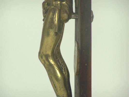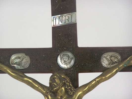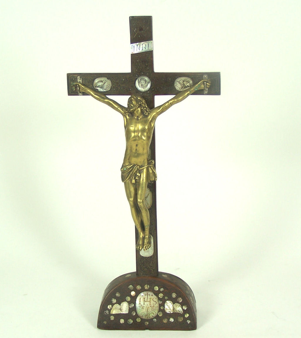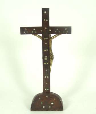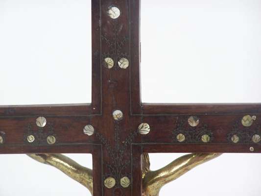 the gilt bronze corpus mounted on rosewood and mother of pearl inlaid cross on domed base