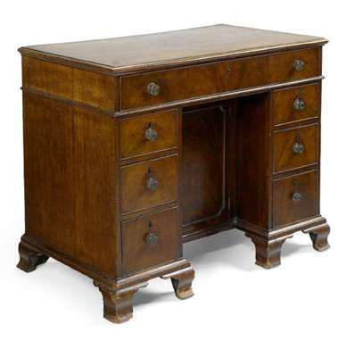 the rectangular top with moulded edge above a full width cockbeaded frieze drawer enclosing a compartmented interior and a recessed cupboard bounded by six short drawers with later brass pull handles, on ogee bracket feet