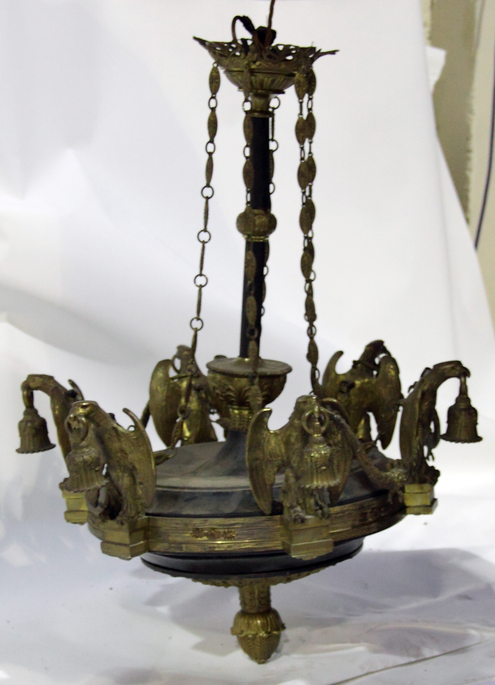 the anthemion cast corona above a reeded column and draped chains to a circular boss with channelled frieze and mounted with six eagles with outstretched wings suspending leaf cast bell-shaped light fittings from their beaks, on a leaf cast pendant finial
