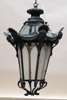 the gadrooned flue with ring mounting hooks above hexagonal glazed sides each tapering to a scrolled open work pendant support, each enclosing a single light fitting, the swagged friezes mounted to each of the six corners with a putto mask shaded by a scallop shell