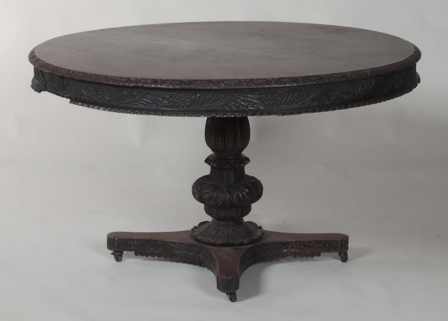 the circular top over a floral carved frieze, raised on a carved baluster turned support, X frame base