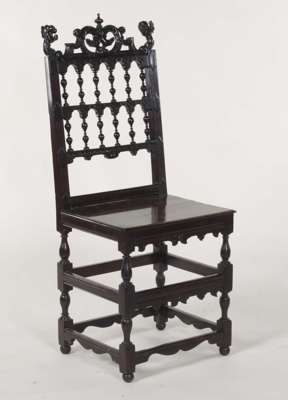 the floral carved top-rail over two rows of bobbin turned splats, moulded plank seat raised on block and turned legs united by stretchers