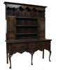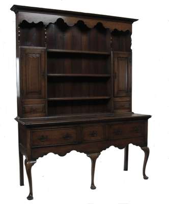 the projected moulded cornice over a shaped apron with open shelves flanked by panelled cupboards, the lower section with three frieze drawers, raised on cabriole legs terminating in pad feet