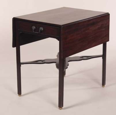 rectangular top over an end drawer and opposing dummy drawer, raised on square legs terminating in brass castors, united by a pierced shaped X frame